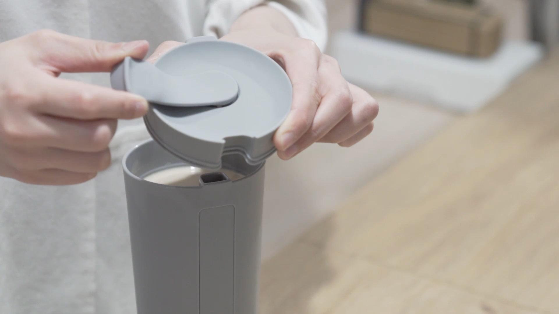 旋開杯嘴蓋才能讓隱藏式排氣孔被打開,避免因壓力導致飲料從杯嘴溢出。
